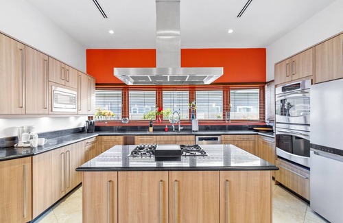 A vacation home as remarkable as this would not be complete without a show-stopping pool. Cascading with palms and a variety of vivacious greenery, this veranda is more of tropical oasis than an outdoor patio. Take a dip, a soak, or simply enjoy dining al fresco in your very own outdoor kitchen, complete with a grill, sink and countertop space. Here, sweet serenity as just a breeze away!