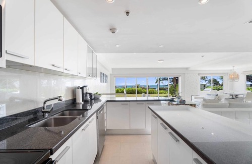 The spacious open-plan living room with mostly floor-to-ceiling glass windows and doors ensures great views of the ocean and resort pool from all angles. It has 2 large sofas with designer chairs, a 10-seat dining table, and a full-sized fully equipped modern kitchen with several extra kitchen appliances that are not commonly found in vacation accommodations. There is also a washer and dryer in the laundry room, as well as the guest's half-bathroom.