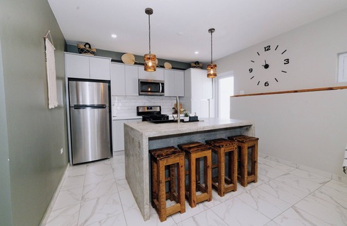 Your personal space includes a spacious living room and an open-concept kitchen with a custom concrete island and rustic wood benches, equipped with all the cooking amenities for a comfortable stay. The master bedroom boasts a cozy custom frame and nightstands, complemented by a memory foam king mattress, while the second bedroom features a custom frame, a queen memory foam mattress, a dresser, and a smart TV. Both bedrooms share a luxurious bathroom with a hand-carved sink and a spa shower experience.