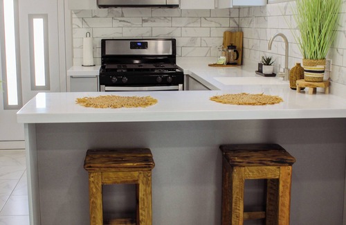 Your personal space includes a living room with a smart TV, an open-concept kitchen with a bar and stools, and all the amenities you need for a comfortable stay. The master bedroom boasts a custom frame and nightstands, a premium memory foam king-size bed, and an en-suite bathroom featuring a hand-carved sink and a luxurious spa shower experience.