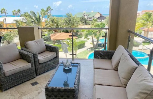 Forget your worries in this spacious and serene ocean view condo, two bedrooms, two full bathrooms, large living/terrace area 1,400sf, free wifi, A/C,Tv's, resort style pool, BBQ grills, jacuzzi, gym, 24 hours security, private parking, safe box. Only steps away from the best beach on the Island and top five in the world the amazing "Eagle Beach", close to restaurants and supermarkets. Beach chairs, towels and cooler provided.There is a doorbell camera monitoring the front door and the hallway of the apartment building.