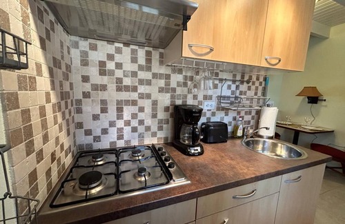 Step inside to find a warm and inviting space designed for relaxation. The studio features a comfortable queen-size bed, ensuring you enjoy a restful night's sleep after a day of exploration. A small kitchenette is available for you to prepare your favorite meals or snacks, and the intimate dining table is perfect for enjoying home-cooked dishes or planning your next adventure.